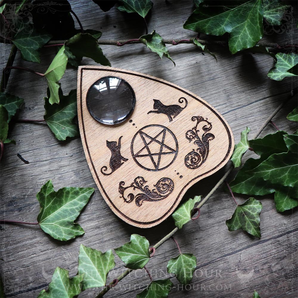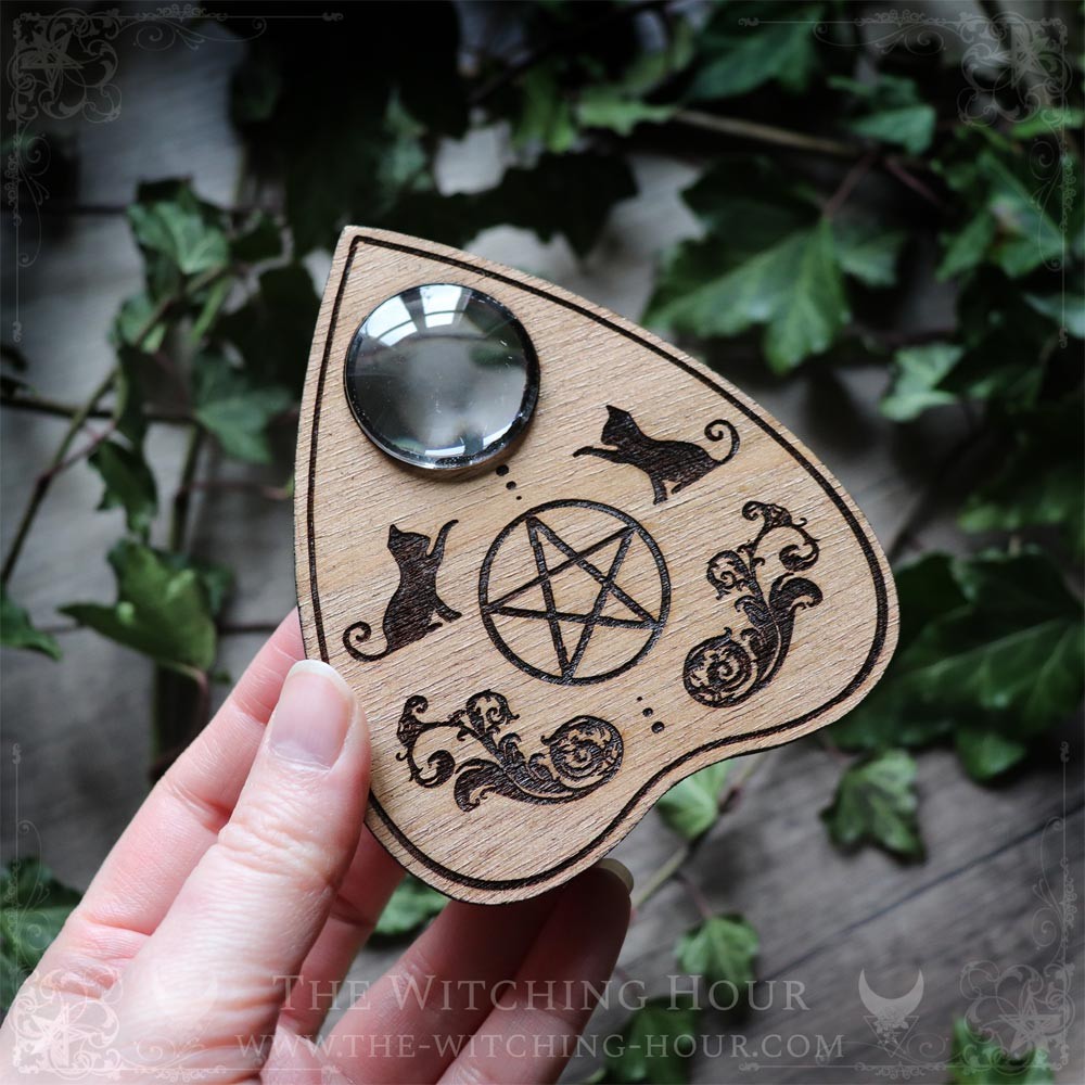 Cette goutte pour planche ouija est ornée de petits chats et d'un pentacle. Fabriqué artisanalement en bois gravé, peint et vernis.