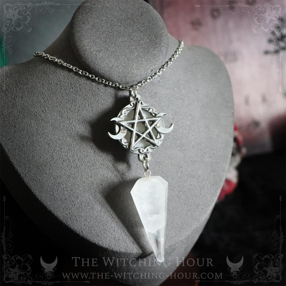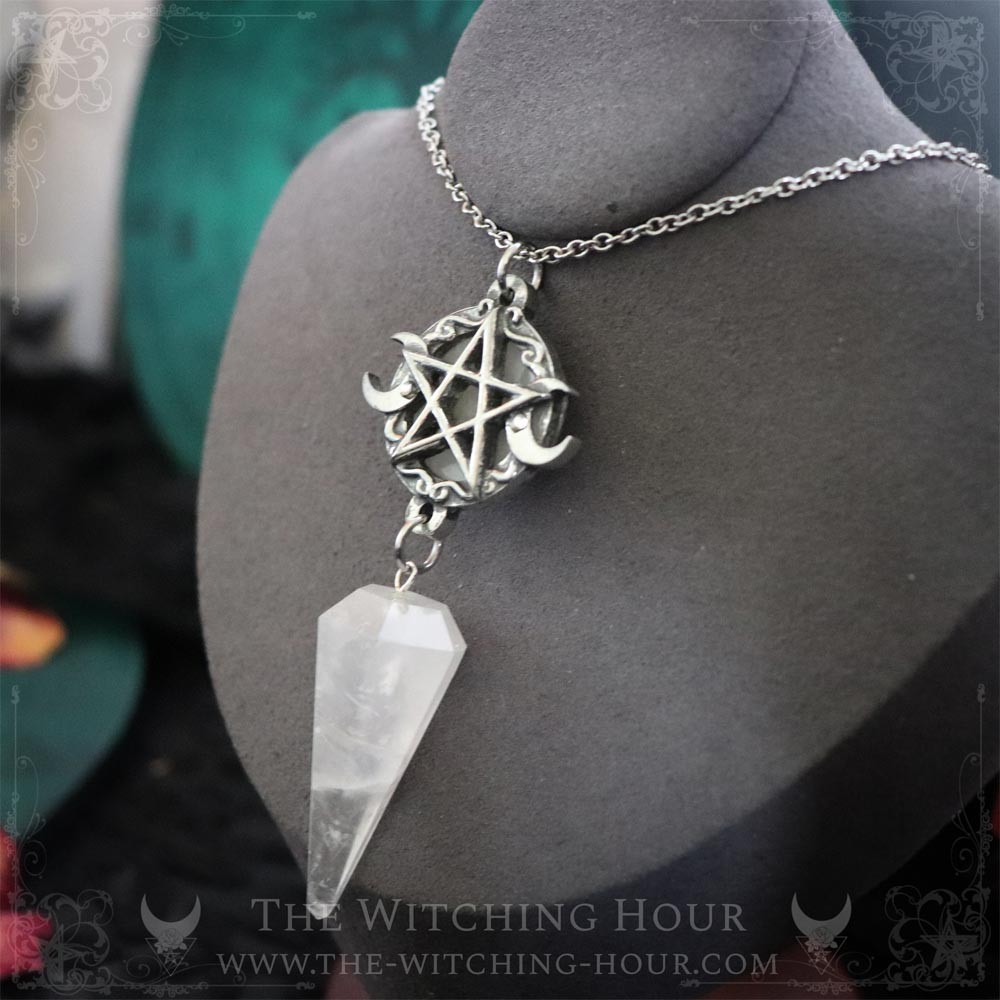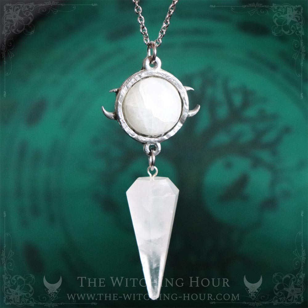 Ce collier pendule est orné d'un pentacle symbolisant l'union de l'esprit aux éléments naturels (eau, terre, air et feu) entouré de deux croissants de lune et surmonté d'un large cabochon en pierre de lune arc-en-ciel (labradorite blanche). Sa pierre pendule est en cristal de roche naturel.