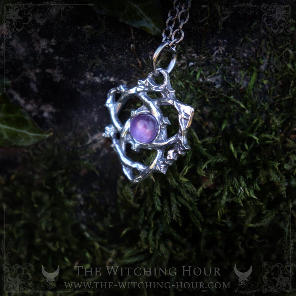 Ce pendentif représentant un triquetra entouré de feuilles de lierre, est orné d'un cabochon en pierre naturelle. Le triquetra est un symbole celtique utilisé au sein du paganisme pour symboliser la triple déesse, mais aussi les éléments naturels (la terre, l'eau et l'air).