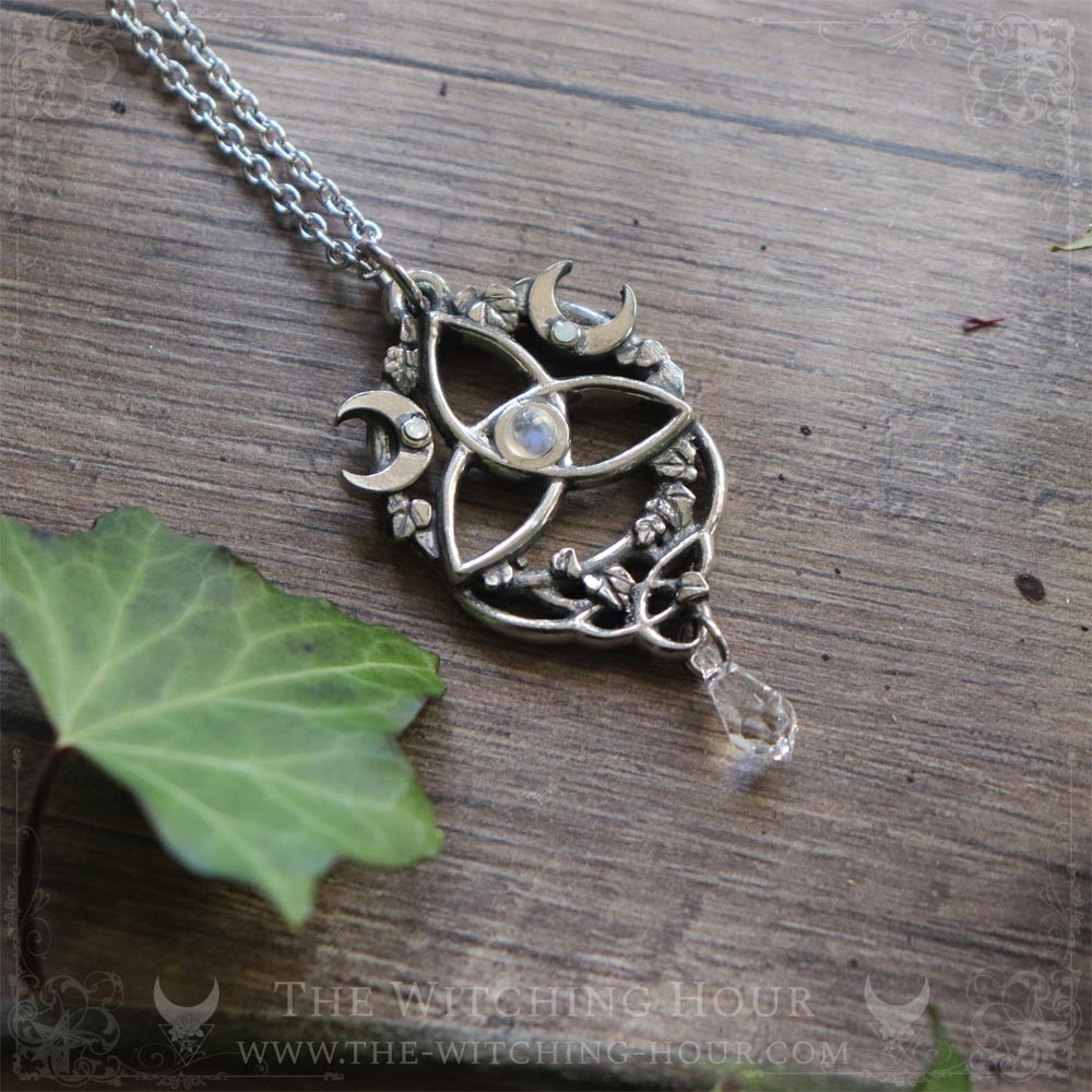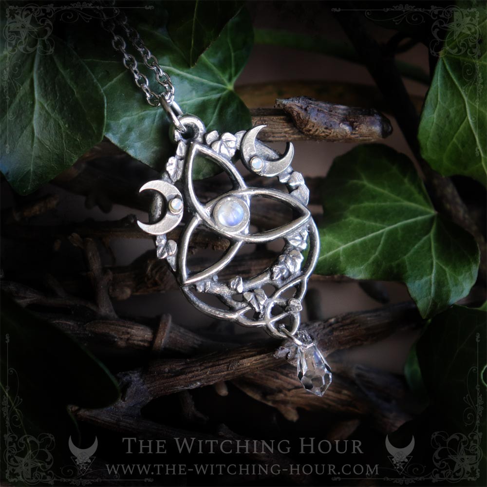 Ici ce merveilleux symbole se voit orné de deux petits croissants de lune faisant référence à la triple lune, et par extension à la triple déesse. L'ensemble est surmonté d'entrelacs et de feuilles de lierres, symbole de vie éternelle, pour former un joli pendentif elfique qui vous transportera dans son univers mêlant fantasy et paganisme.