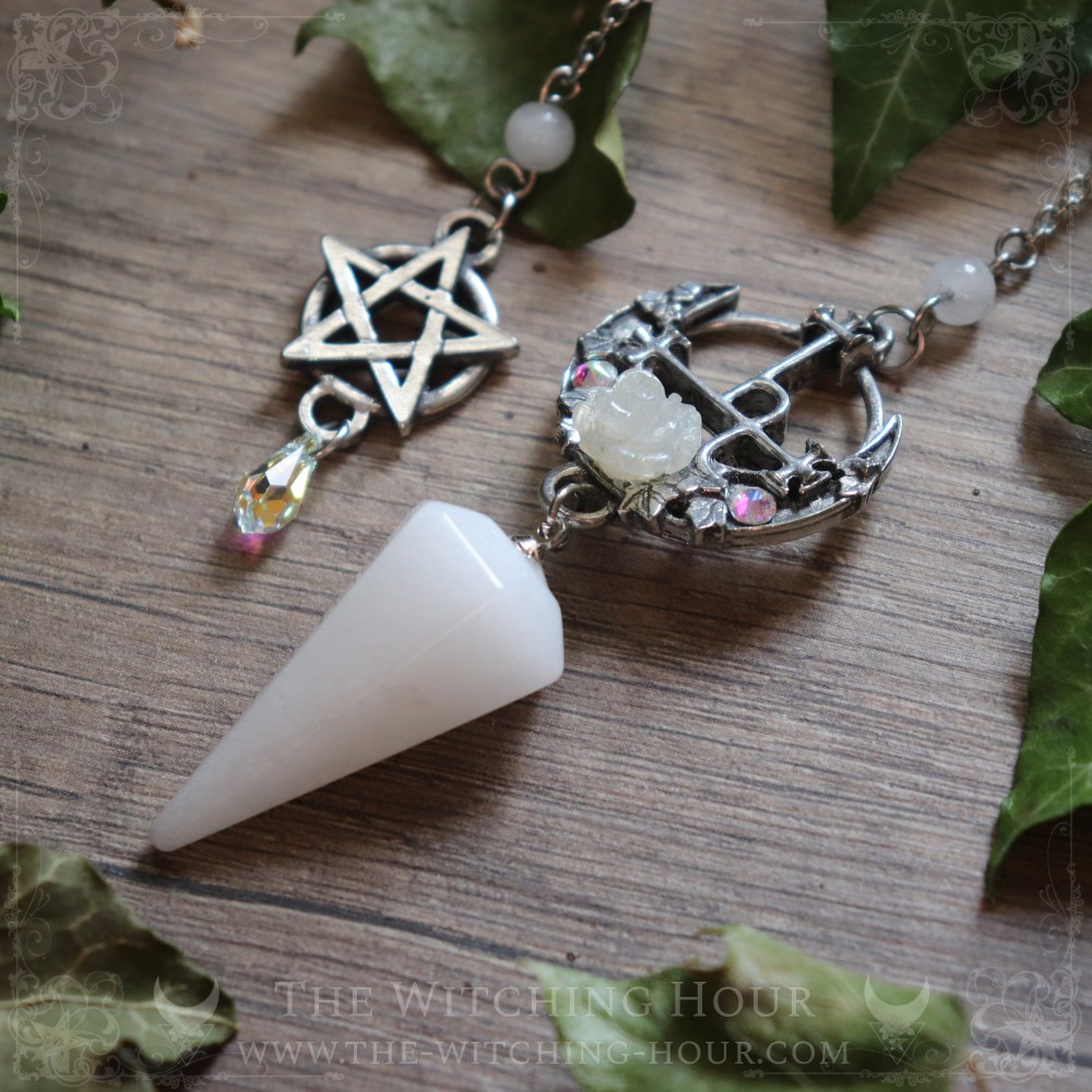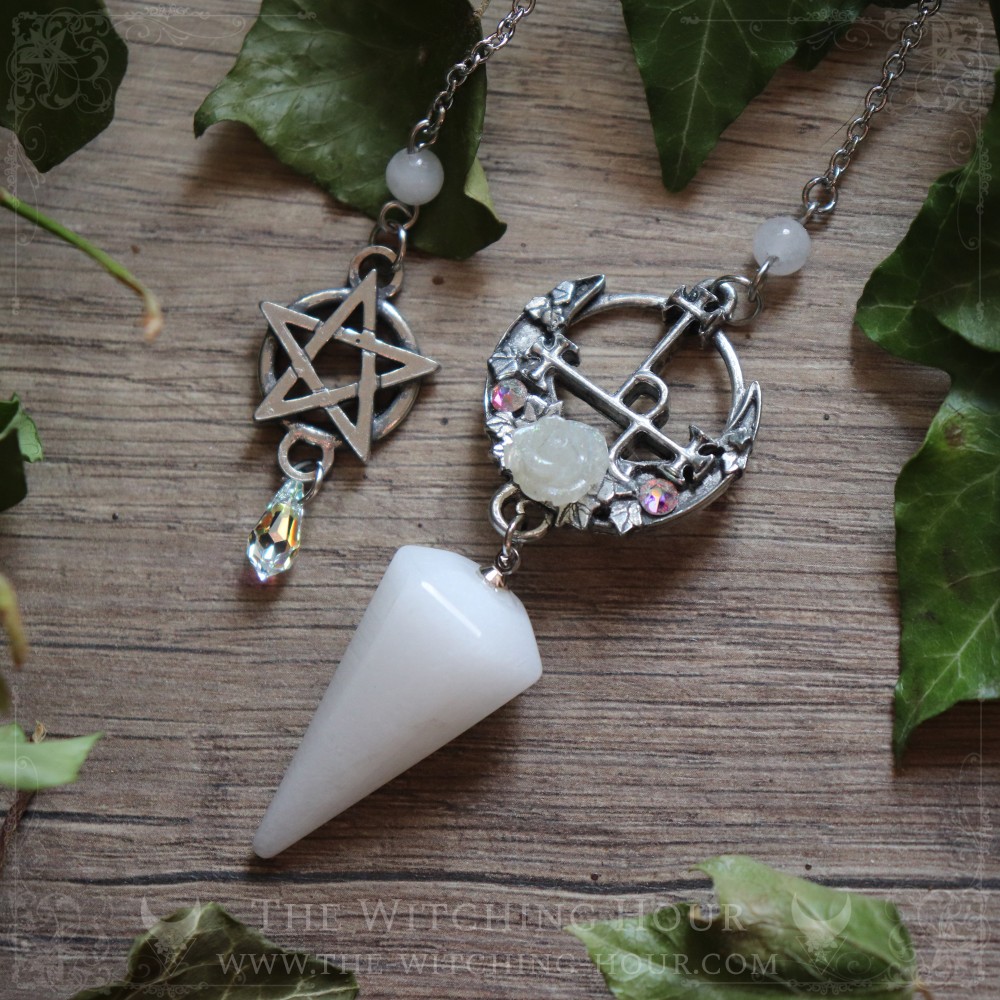 Ce pendule représentant le sigil de Lilith est orné d'une rose en résine, de petits cristaux synthétiques et d'une pierre pendule en larvikite, pierre de lune arc-en-ciel ou en jade blanc, selon votre choix. Sa longue chaîne de 20 cm est décorée d'une perle assortie et d'un pentacle se terminant sur une petite goutte en crystal synthétique.