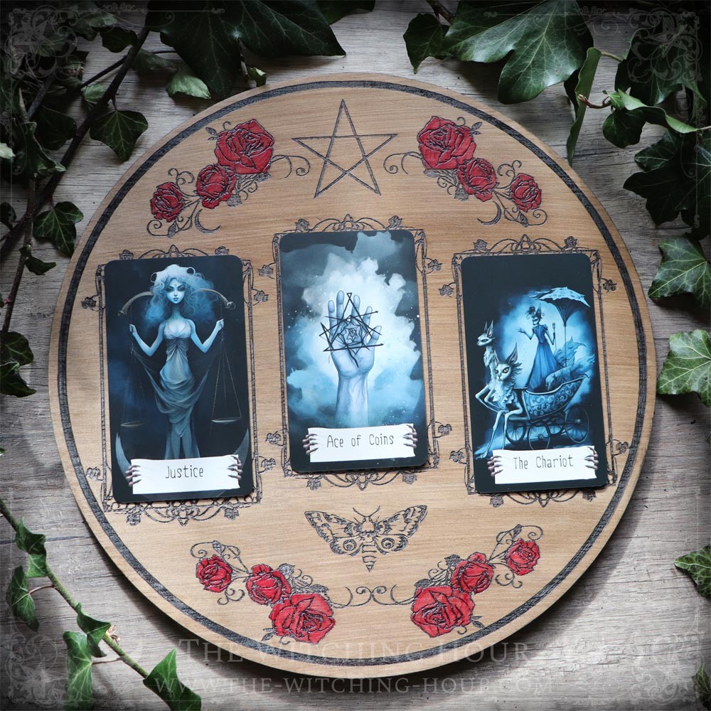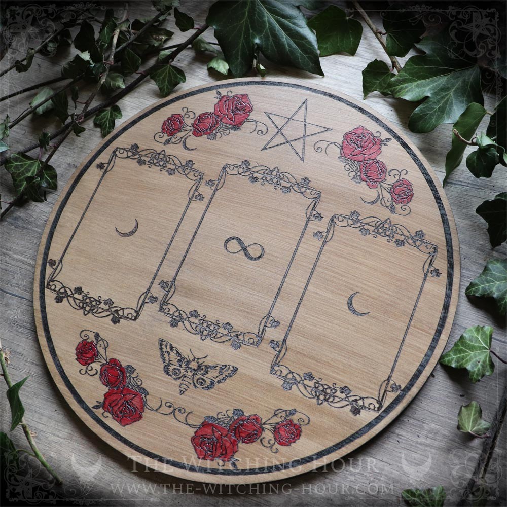 Ce plateau de divination s'orne de roses rouges, d'un pentagramme et d'un papillon de nuit. Les emplacements des cartes sont décorés de croissant de lune, du symbole de l'éternité et de petits triquetras. Faite pour les tirages à trois cartes, elle conviendra aussi bien pour l'utilisation d'un tarot ou d'un oracle.