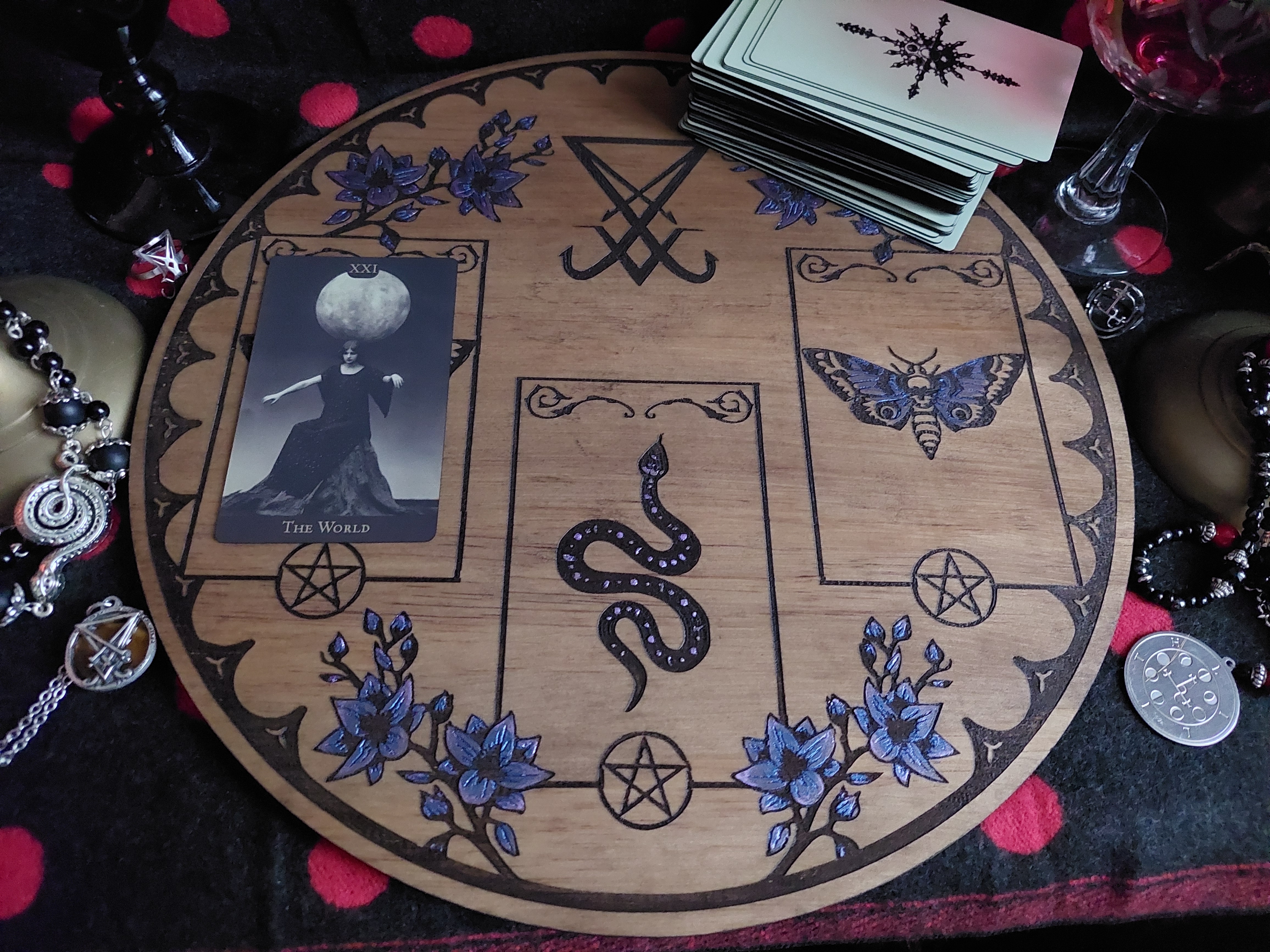 Cette table de tirage divinatoire est ornée du sigil de Lucifer entouré de fleurs nocturnes aux reflets irisés. Chaque emplacement pour les cartes est décoré d'un papillon de nuit ou d'un serpent, ainsi que de pentacles. Faite pour les tirages à trois cartes, elle conviendra aussi bien pour l'utilisation d'un tarot ou d'un oracle.