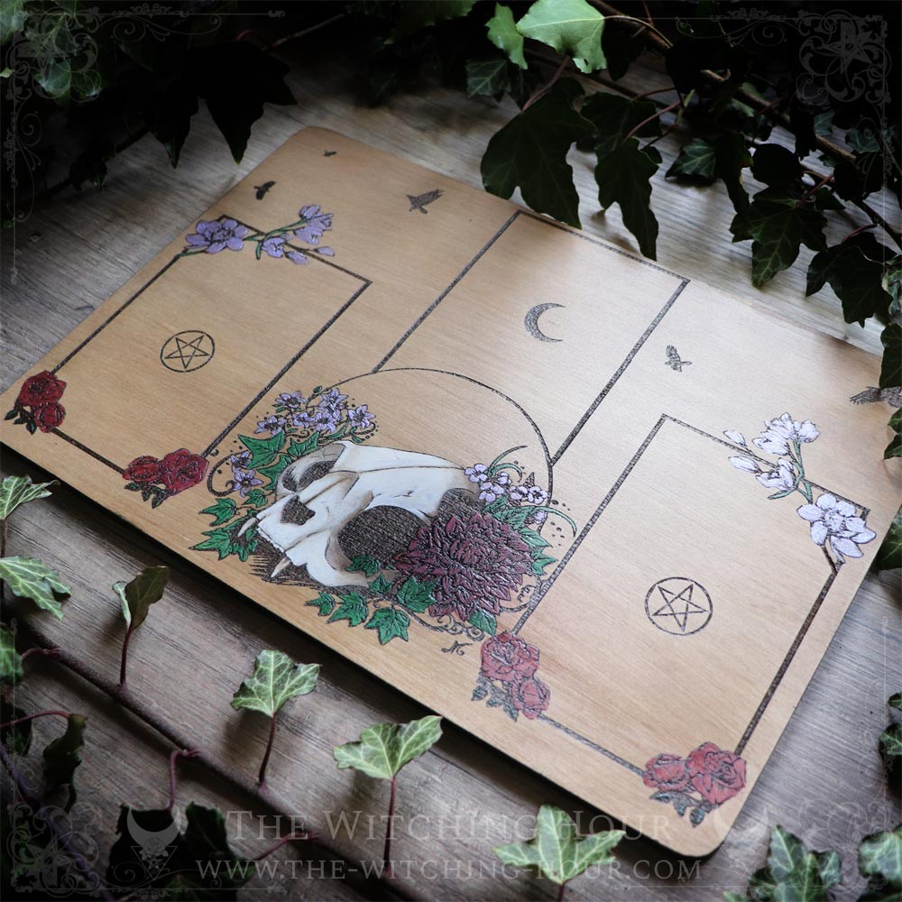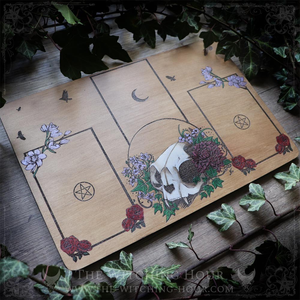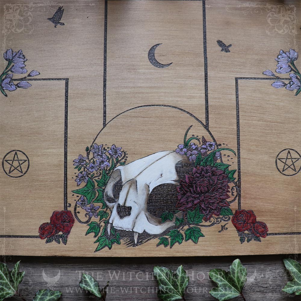 Cette table de tirage divinatoire est ornée d'un crâne de chat entouré de fleurs, de feuilles de lierre. et de corbeaux volant au loin. En bois gravé, puis intégralement peint à la main, ce plateau de divination vous offrira un décor inspirant pour vos tirages, que vous utilisiez un tarot ou un oracle.