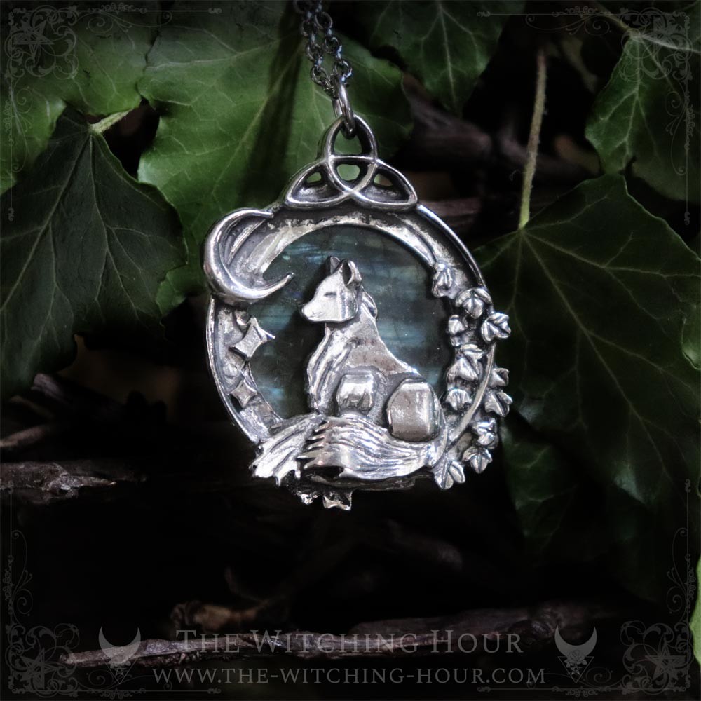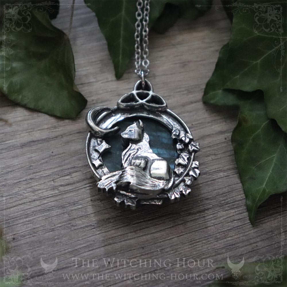 Topped by its triquetra, a Celtic symbol representing the triple goddess, but sometimes also the elements (water, earth and air), or the cycles of life, death and rebirth, this large pendant features a fox under a star-studded night sky, adorned with a small crescent moon. Ivy leaves intertwine around the pendant, enriching the symbolism of this jewelry with its reference to eternal life.