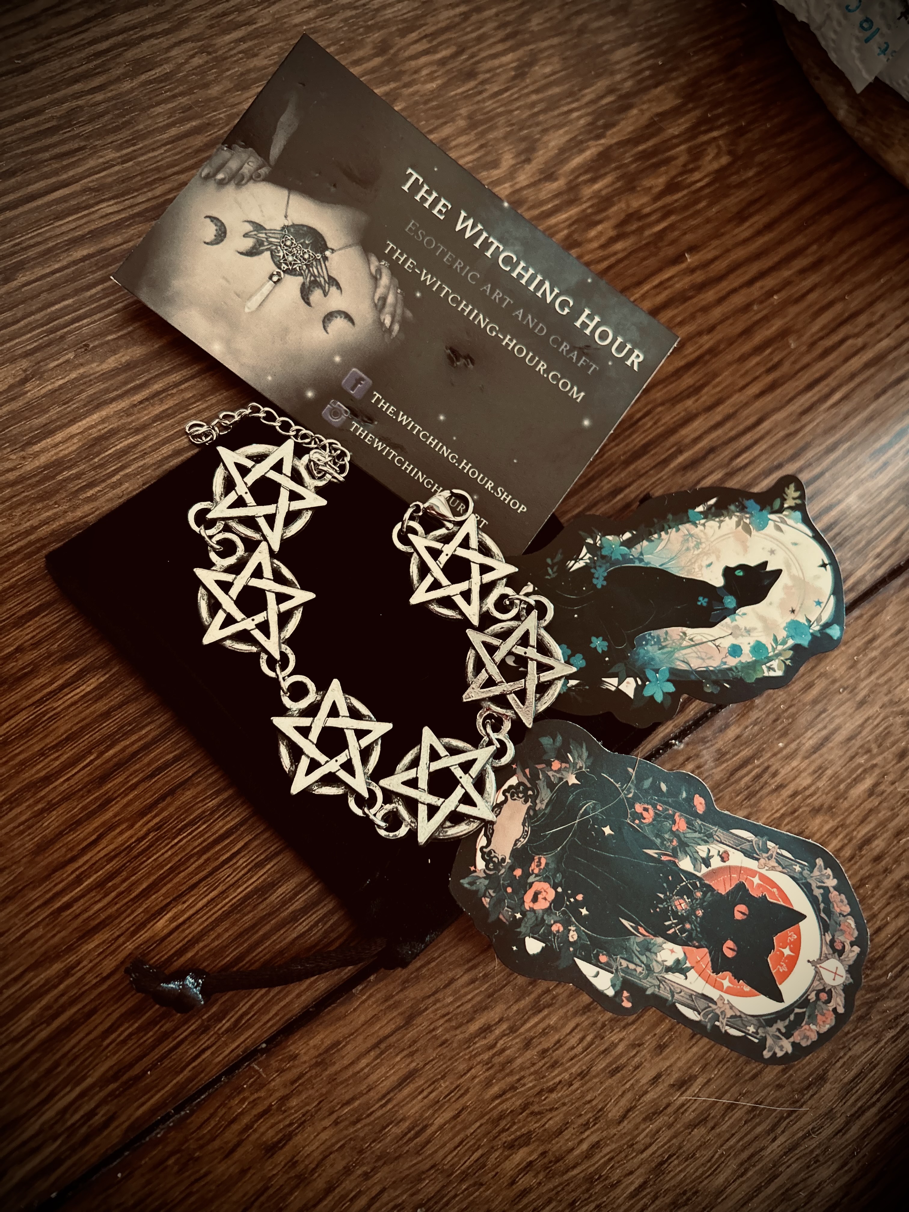 This bracelet consists of six pewter pentagrams and an adjustment chain. The pentagram symbolizes the union of the spirit with the natural elements (water, earth, air and fire) in the immensity of the universe.