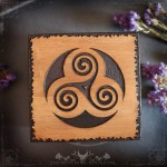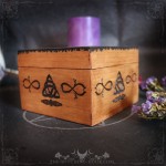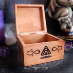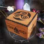 This small wooden box is decorated with a triskel on its lid, and triquetras on its sides. The inside is covered with a brown felt that will protect all the objects you want to store in it.