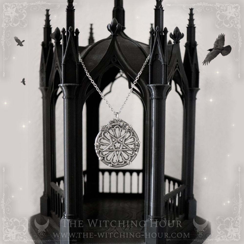 This pentagram pendant is set in the center of a cathedral rose window intertwined with ivy leaves. Inspired by the rose windows of Saint-Sever Church in Rouen and Amiens Cathedral, this piece of jewelry features the powerful protective symbol of the pentagram, offering you a Gothic aesthetic.