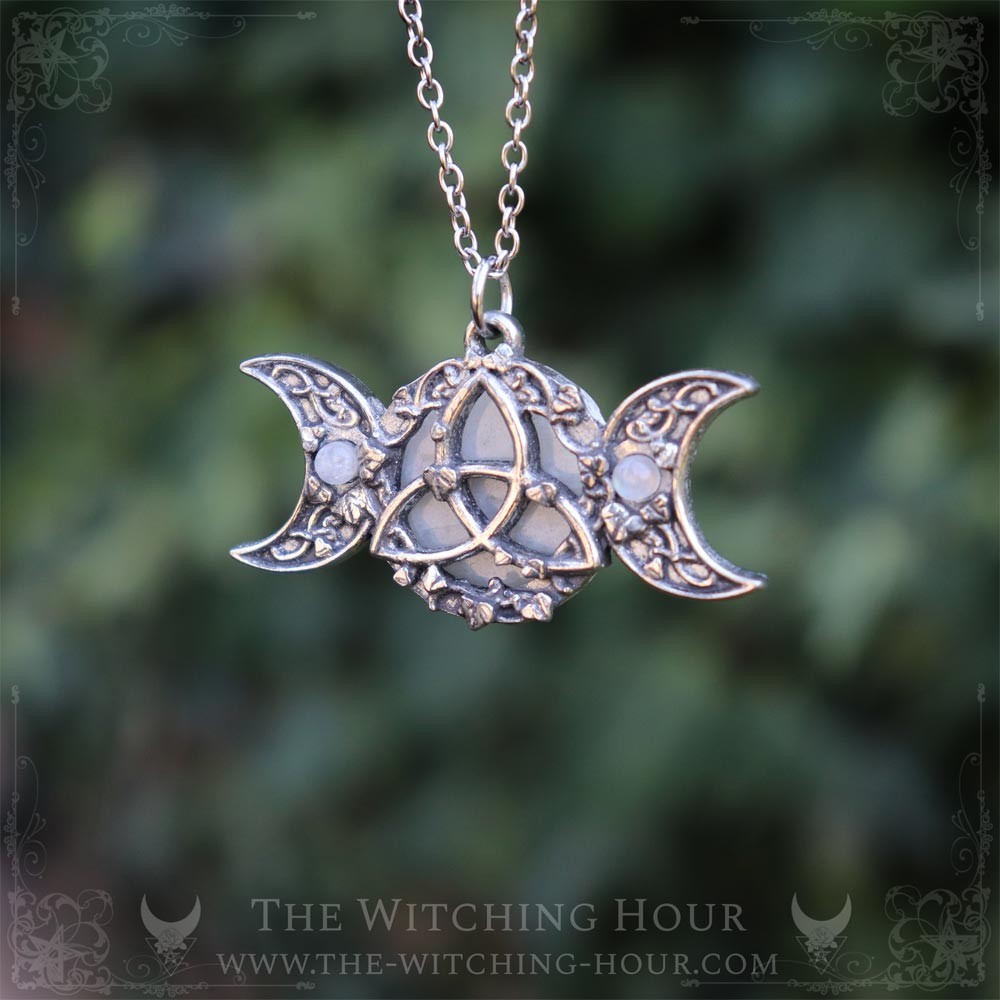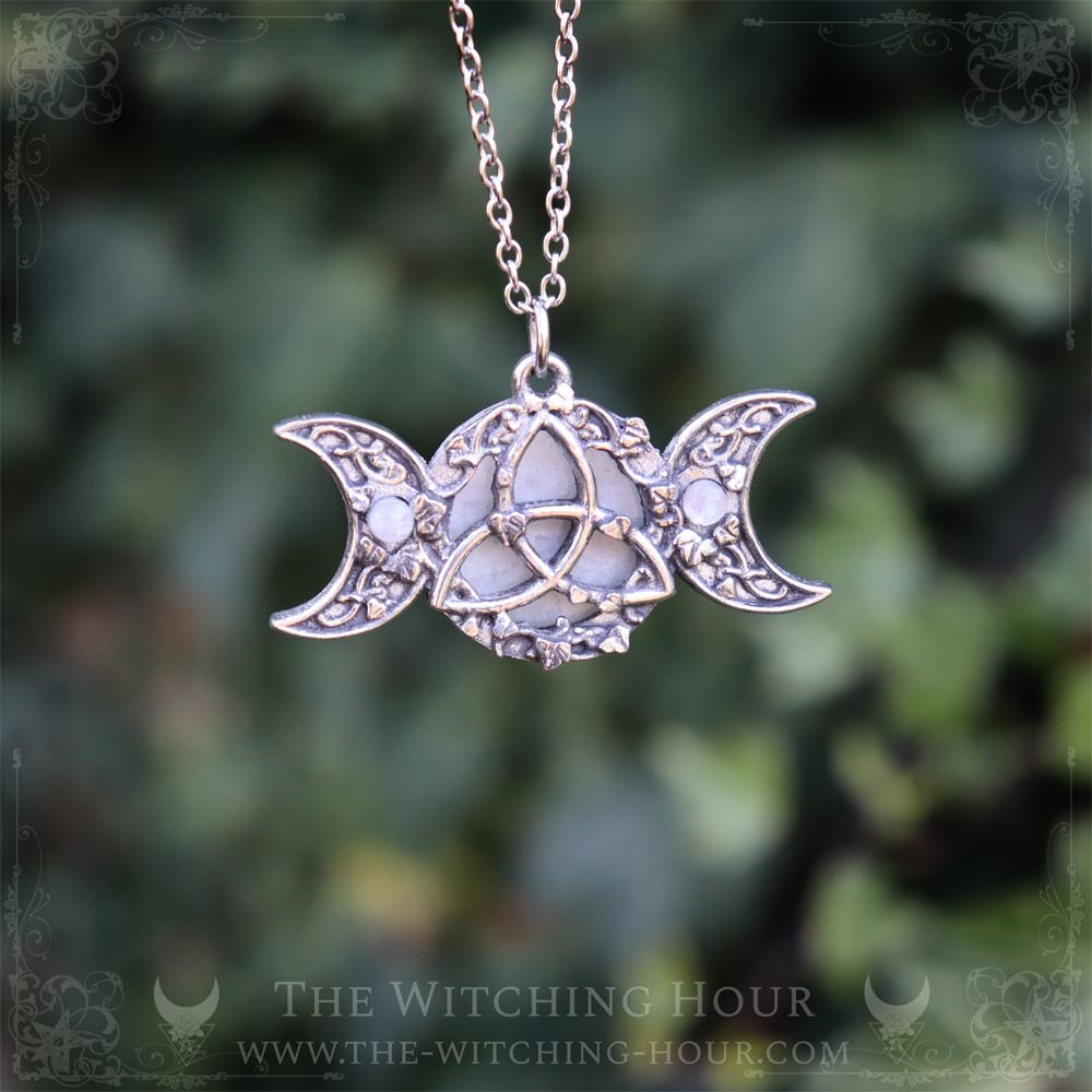 This triple-moon necklace features a triquetra and ivy leaves intertwined in elven ornaments. It is topped by four small 4 mm stones and a large 20 mm cabochon, which you can choose from the drop-down menu.