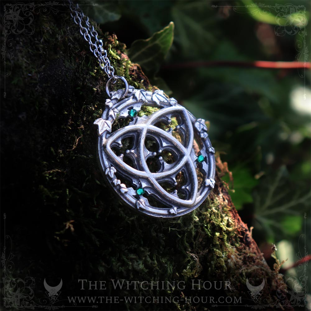 This Gothic triquetra pendant is adorned with three small synthetic crystal cabochons, adding a touch of sparkle to this design inspired by Gothic architecture. The triquetra symbol generally represents eternity, but also unity, balance, and harmony.