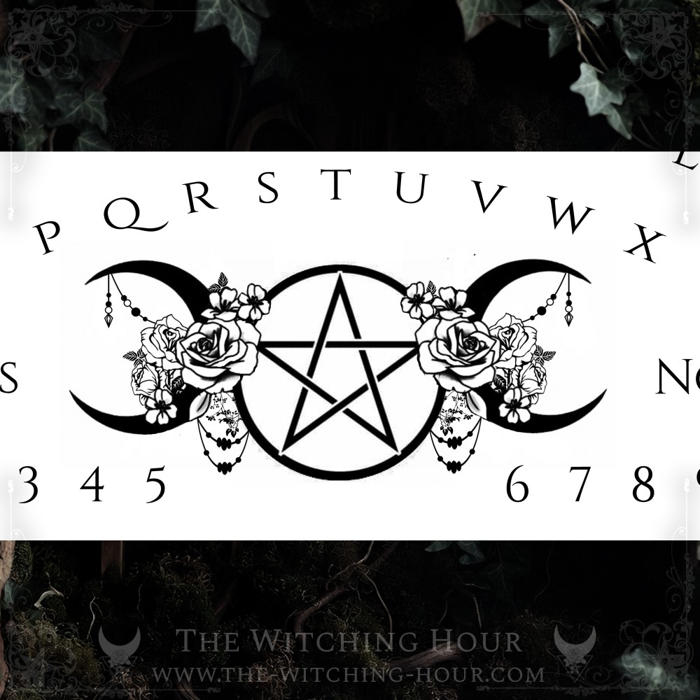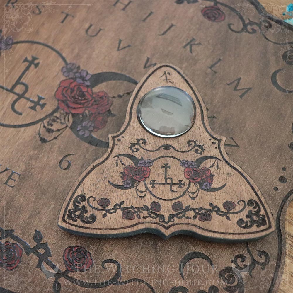 Ouija board decorated with a pentagram surrounded by a triple moon and flowers. Its planchette is topped with glass feet to make it easier to move across the board.