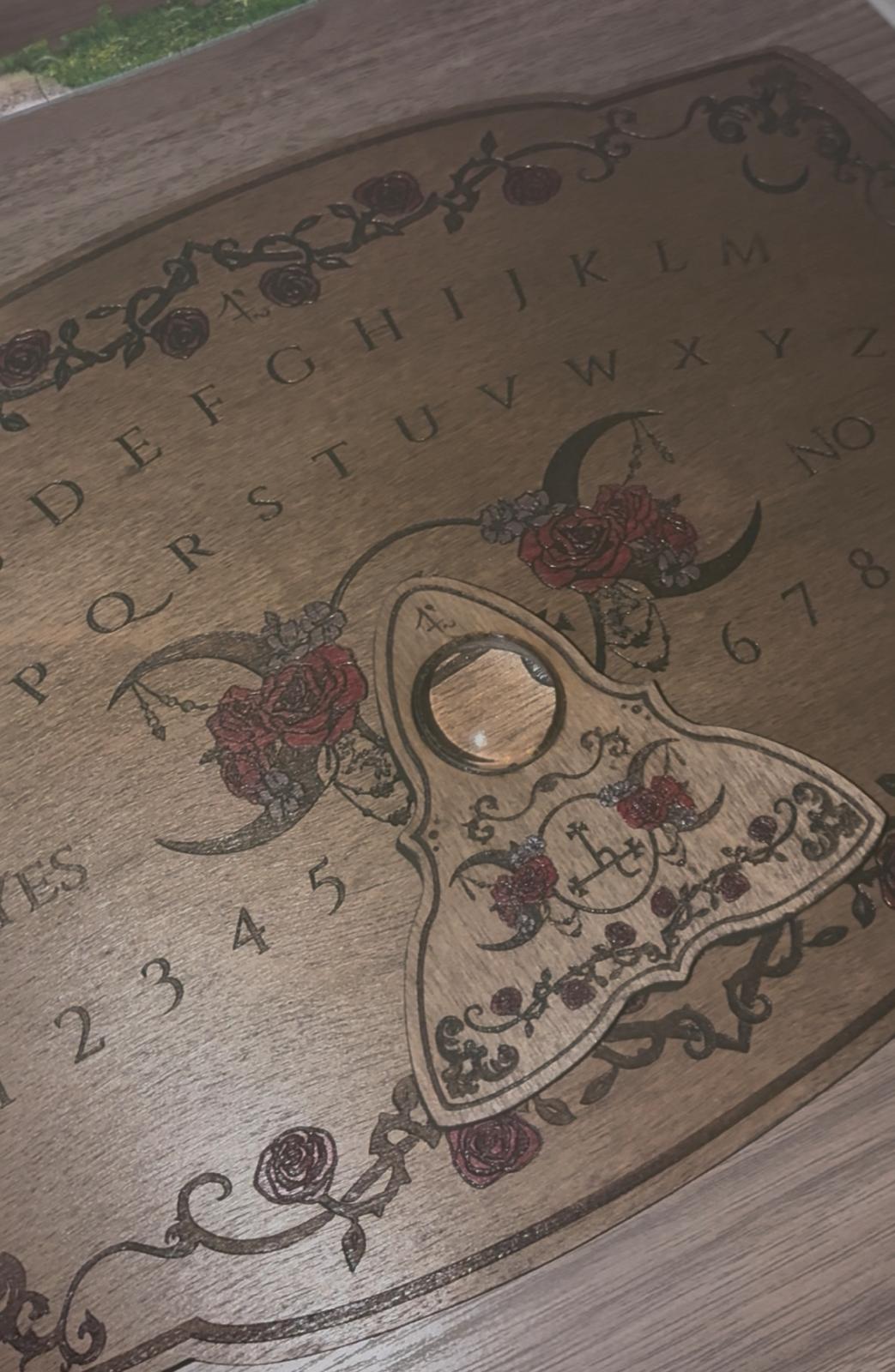 This ouija board features Lilith's sigil surrounded by a triple moon and flowers linked to Lilith's energy. Handcrafted in our small workshop, this ouija board has been engraved, then painted and varnished by hand. Its pointer has glass feet to make it easy to move on the board.