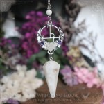 This pendulum representing the sigil of Lilith is decorated with a resin rose, small synthetic crystals and a natural larvikite, rainbow moonstone or white jade pendulum stone, depending of your choice. Its long chain of 20 cm is decorated with a matching bead and a pentagram ending on a small drop.